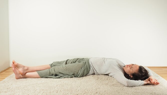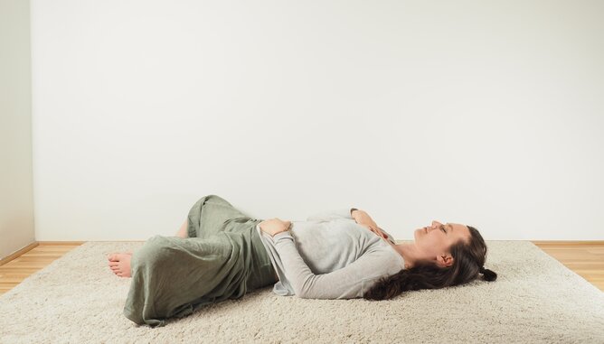 - Lege dich in Rückenlage bequem auf deine Matte oder ins Bett.