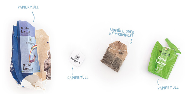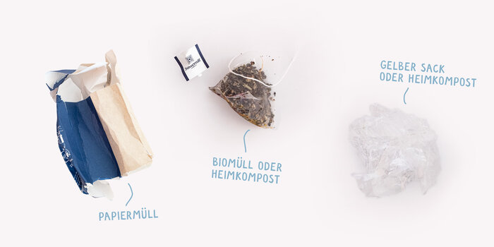 Damit sich der Geschmack während der Lagerung nicht verflüchtigt, packen wir die Teebeutel in eine Aromaschutzhülle. Aktuell wird das Material dieser Hülle umgestellt. Aufgrund der unterschiedlichen Zusammensetzung müssen bisherige und neue Hüllen auf unterschiedlichem Wege entsorgt werden.