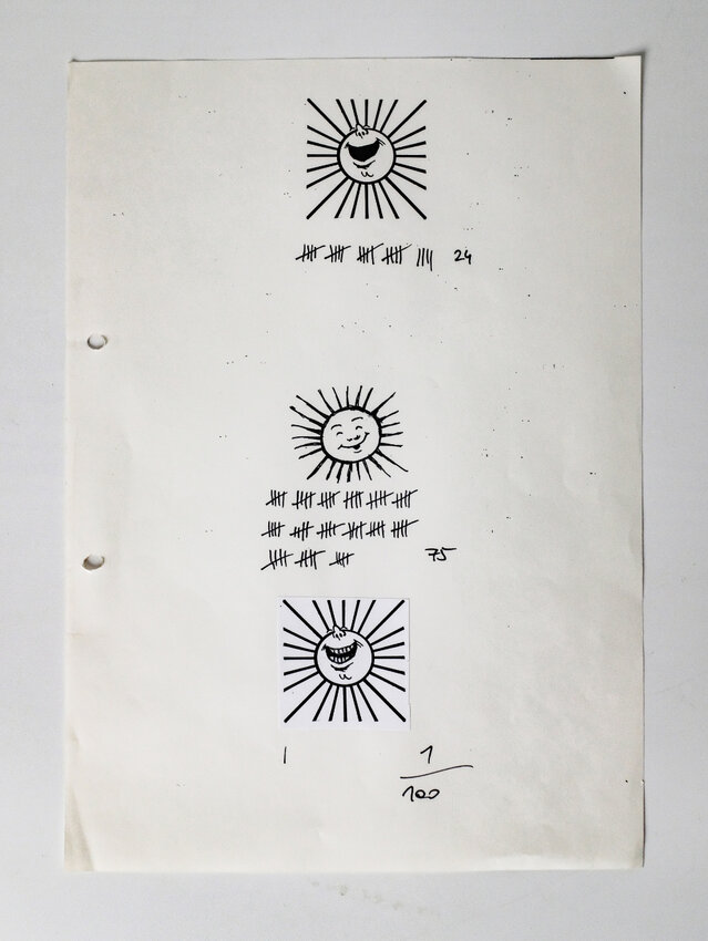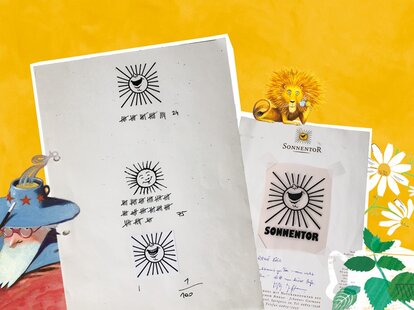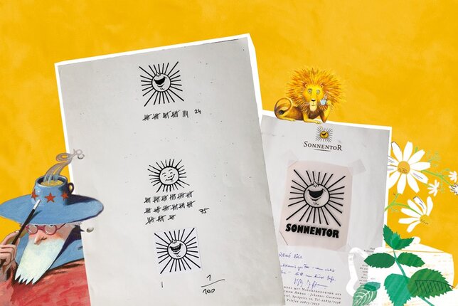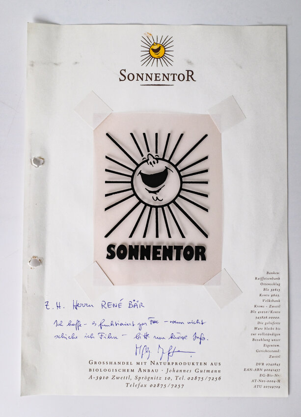 Dieser Gedanke des freien, guten Lebens gefiel Hannes – er wählte das SONNENTOR als Name für seine junge Firma und die Sonne sollte naheliegenderweise zum Logo werden. Dafür brauchte es aber natürlich auch eine professionelle Gestaltung. Hannes kontaktierte seinen Freund Johannes Fessl, der Maler war – und zwar nicht irgendeiner, sondern „ein studierter“. Er lieferte eine Skizze mit einer lachenden Sonne, die Hannes gut gefiel. Er fand allerdings, dass der breit grinsende Mund noch Zähne vertragen könnte. Also griff er kurzerhand selbst zum Kuli und gestaltete eine zweite Variante inklusive Zähne. Logo-Ideen gab es also – jetzt wollte Hannes noch wissen, was die Leute auf der Straße, also seine potenziellen Kund:innen dazu sagen würden. Er begab sich zur Marktforschung also auf den Zwettler Hauptplatz. Dort hielt er 100 Menschen die beiden Skizzen und zusätzlich eine einfache Kinderzeichnung einer Sonne unter die Nase. Zu Hannes‘ Überraschung fühlten sich drei Viertel der Menschen von der Kinderzeichnung am meisten angesprochen. Auf Platz zwei folgte die zahnlose Sonne, die Variante mit Zähnen fanden die wenigsten Menschen ansprechend. Aus einem Bauchgefühl heraus entschied sich Hannes schließlich für den Mittelweg: Die lachende Sonne, wie von Maler Fessl vorgeschlagen, wurde zum SONNENTOR Logo.