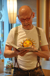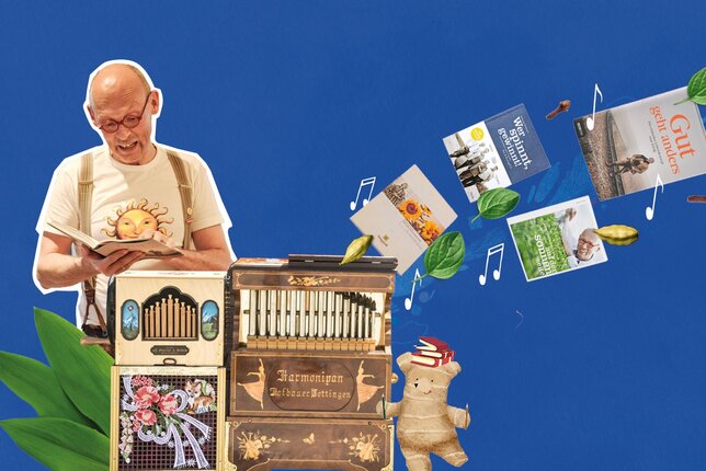 Das Foto ist eine Collage, auf der steht Hannes hinter einer Drehorgel, aus welcher die Bücher fliegen, die er geschrieben hat.  | © SONNENTOR