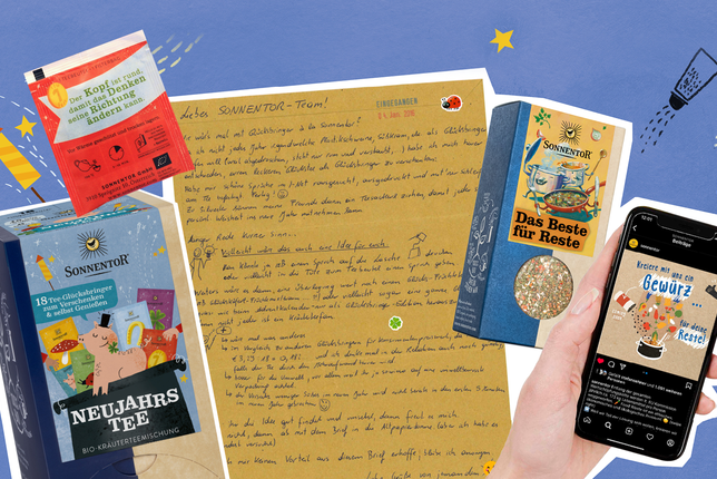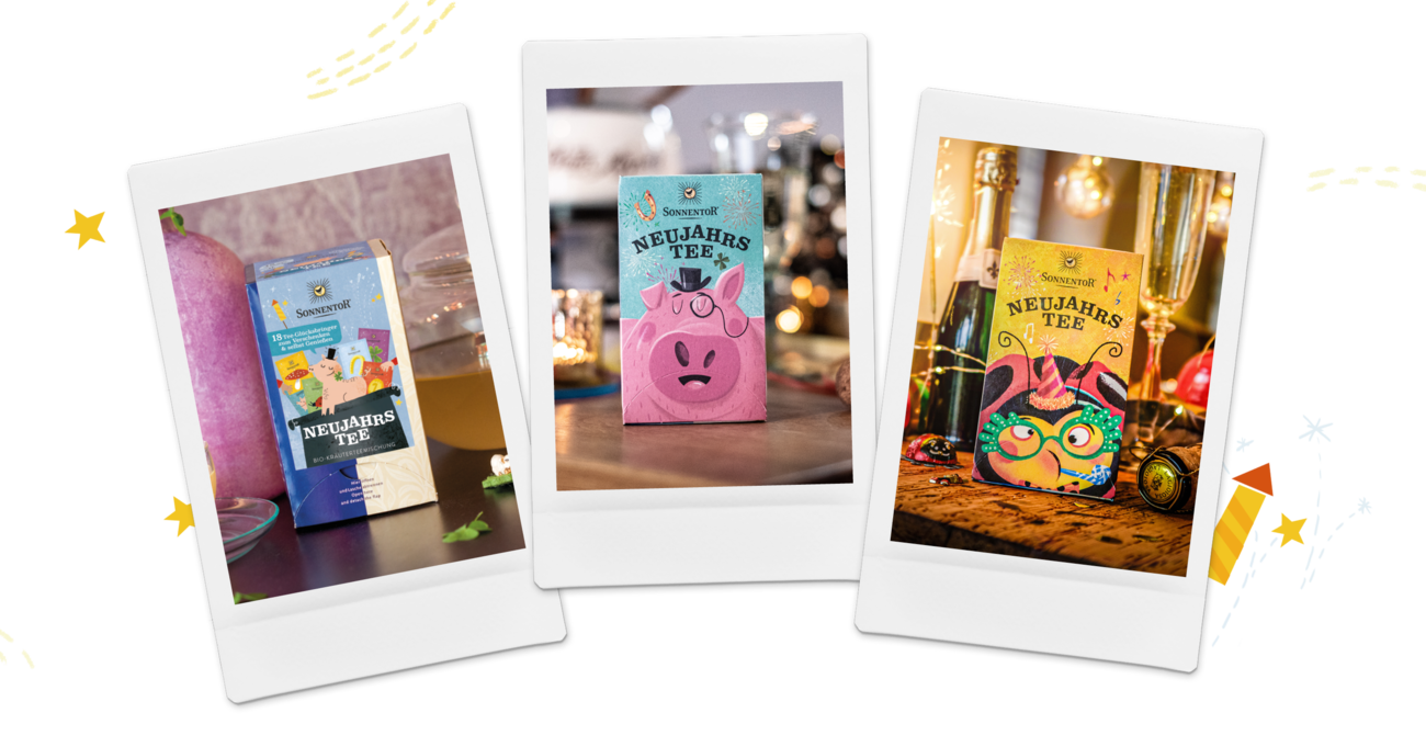 Eine ganz besondere Entstehungsgeschichte gibt es zum Neujahrstee. Kurz nach dem Jahreswechsel, Anfang 2016, landete ein Brief bei uns in Sprögnitz. Darin berichtete eine Person, dass sie genug von Plastikschweinchen und Süßkram habe und sich einen nachhaltigen Glücksbringer nach SONNENTOR Art wünsche. Daher hatte sie kurzerhand nette Sprüche am Glückstee befestigt und zu Silvester an Freunde verschenkt -tadaaa, der Neujahrstee war geboren!