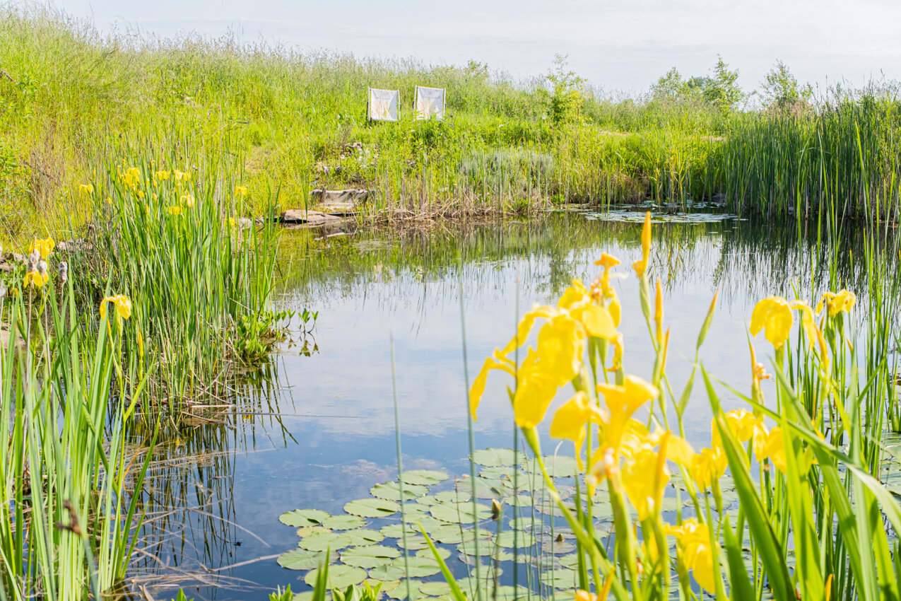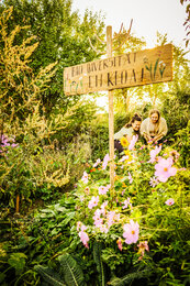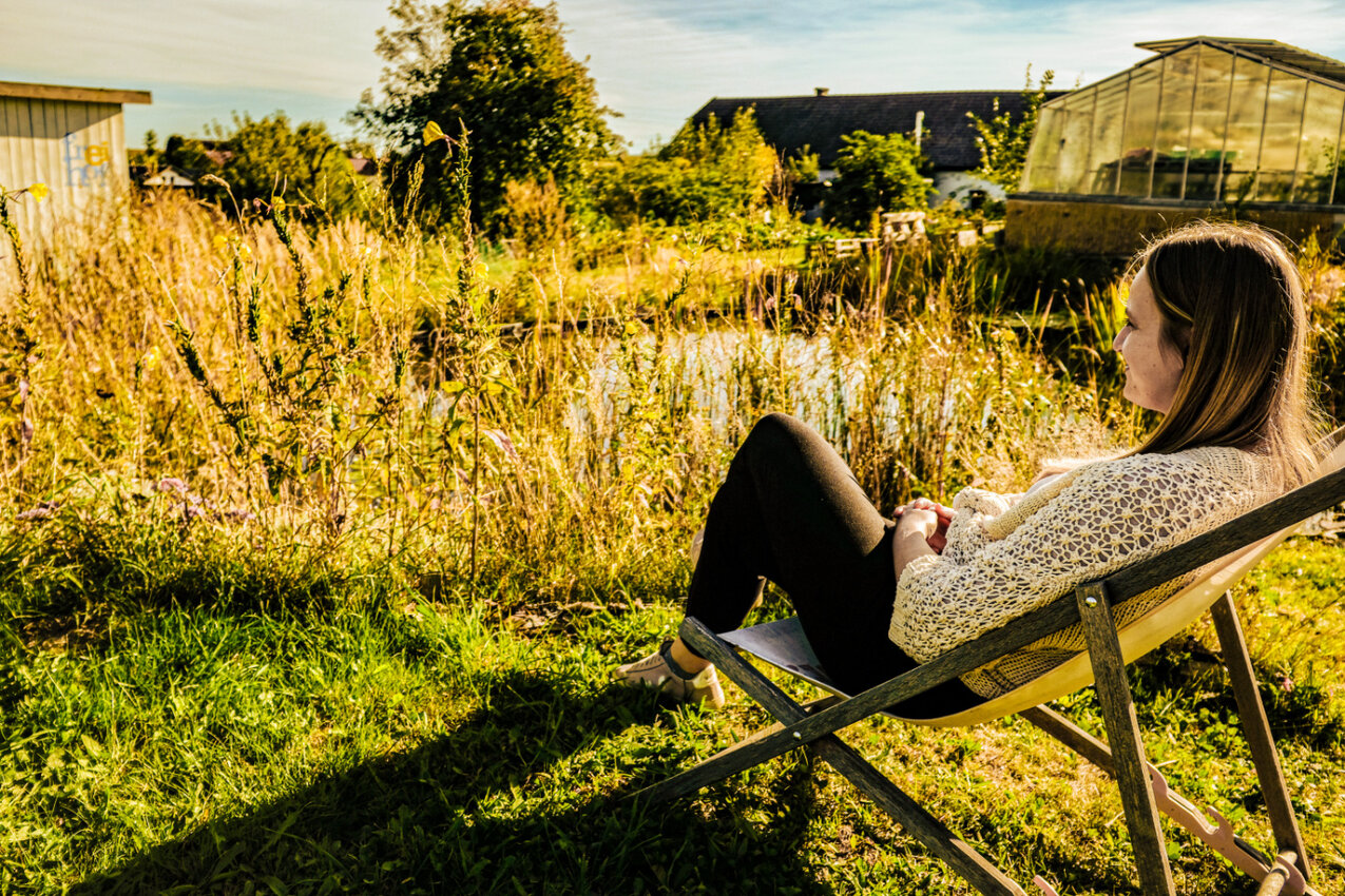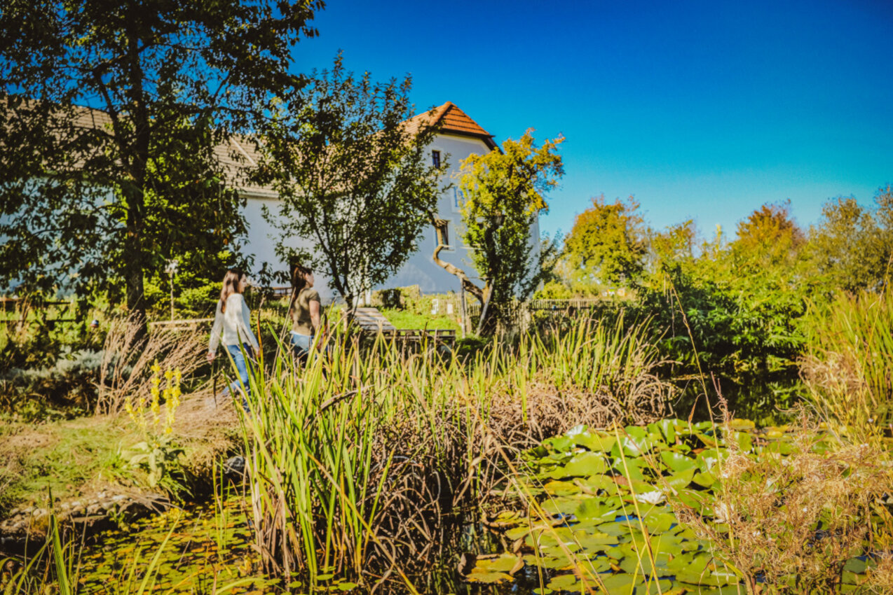 Beim großen Teich warten zwei gemütliche Liegestühle, von denen aus wir den Tanz der Wasserlebewesen beobachten können. Schautafeln erklären, dass das Sammeln und Speichern von Wasser ein Grundprinzip der Permakultur ist und viele Nützlinge auf diesen Lebensraum angewesen sind. Bei unserem Streifzug lernen wir verschiedene Wildniszonen kennen mit Totholz, Steinen und Hecken. Wir erkennen Naschhecken für Menschen und Tiere und sinnieren mit Maria im Bauerngarten über die Möglichkeiten der Selbstversorgung am eigenen Balkon und im Garten.