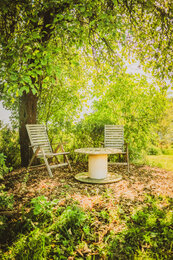 Wir beenden unseren Besuch beim Yoga-Deck, das uns als einer der vielen gemütlichen Plätze im Garten die Gerüche in der Luft, den Wind auf der Haut, das Rauschen der Blätter und die Farbe rund um uns ganz bewusst entdecken lässt.