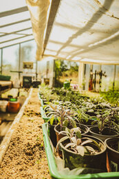 Dass am Hof natürliche Ressourcen wie Wasser und Nährstoffe im Kreis geführt und effizient genutzt werden erfahren wir im Glashaus, wo die Jungpflanzen herangezogen werden. Küchenabfälle etwa werden kompostiert und hier als Dünger genutzt.