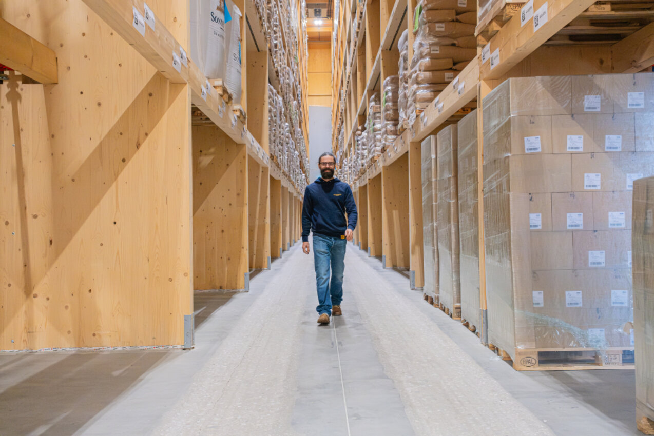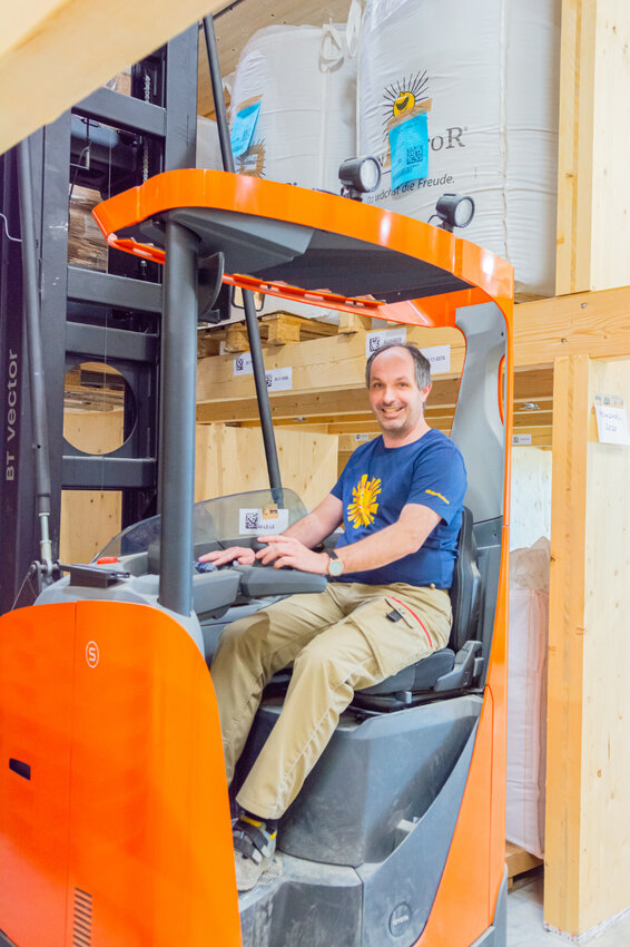 „Bei Erweiterungen und Investitionen steht immer unsere Firmenphilosophie gepaart mit Nachhaltigkeit ganz am Beginn aller Überlegungen“, erzählt Schätze-Hüter Dietmar Schimani. Gemeinsam mit seinem Team ist er für unser Lager und das Supply-Chain-Management verantwortlich. Schon lange hat er sich – gemeinsam mit unseren beiden Geschäftsführern Klaus Doppler und Gerhard Leutgeb – mit der Errichtung einer neuen Lagerhalle beschäftigt. „Wir wollten ökologisch bauen, den Ressourcen- und Energieverbrauch minimal halten und auch innovative Maßstäbe setzen. Die Verwendung von Holz als nachhaltiges und nachwachsendes Material war daher für uns schon relativ früh klar“, ergänzt Dietmar. Nach knapp zwei Jahren Planungsphase konnte im November 2020 der erste Bagger anrollen. Der offizielle Baustart erfolgt dann im April 2021 und nach ziemlich genau einem Jahr intensiver Bauzeit konnte das neue Hochregallager im Frühling 2022 in Betrieb genommen werden. Besonders stolz sind unsere drei Masterminds auch darauf, dass das gesamte Projekt mit regionalen Firmen abgewickelt werden konnte und die Wertschöpfung somit bei uns im Waldviertel geblieben ist.