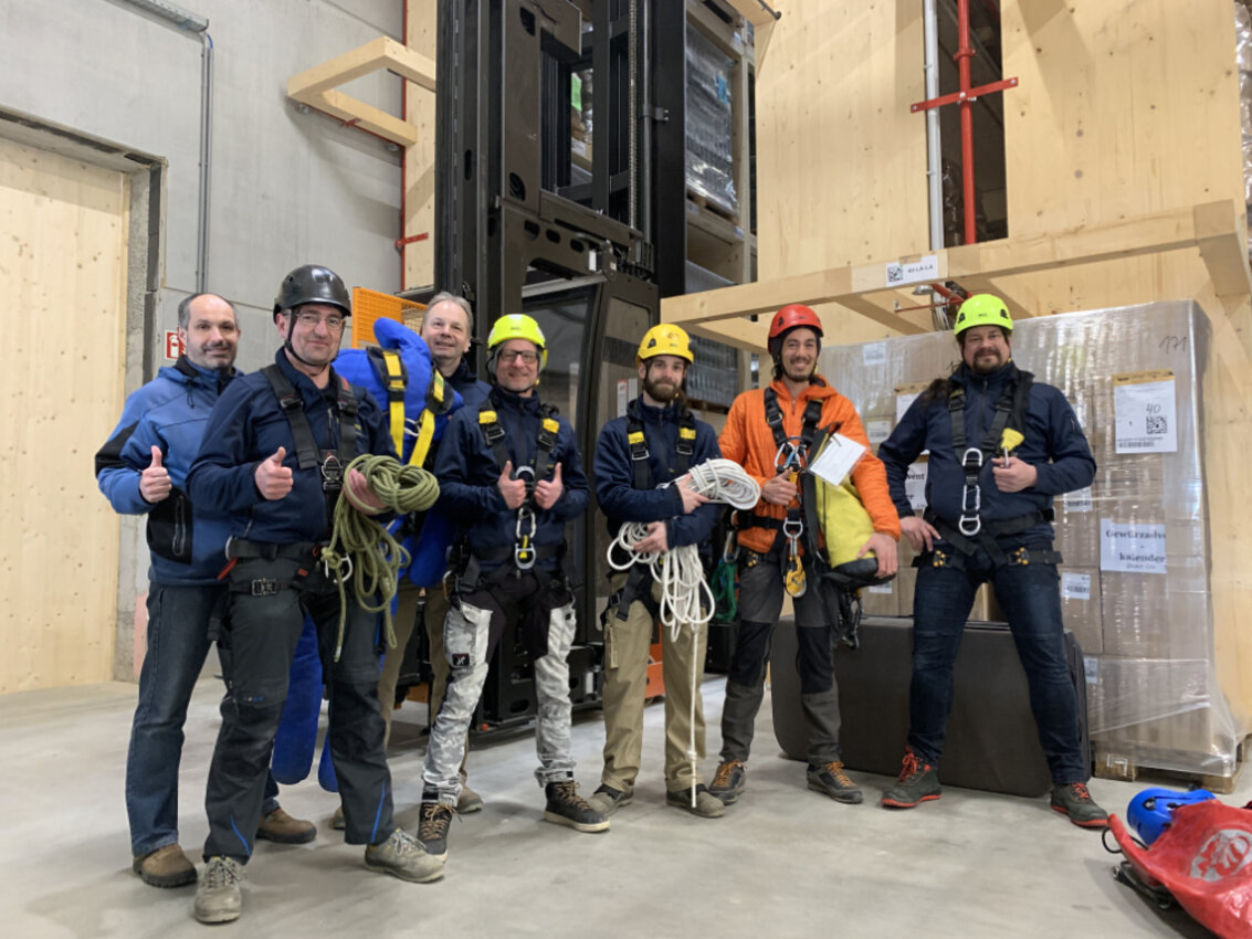 Doch bevor überhaupt etwas eingelagert werden konnte, musste trainiert werden – und zwar in luftiger Höhe. Denn Sicherheit geht vor! So absolvierte unser Lager-Team rund um Klaus und Erwin ein Abseiltraining aus 17 Metern Höhe. Warum? Weil unsere Lagerist:innen in der Fahrerkabine des Staplers beim Ein- und Auslagern der Ware bis ganz nach oben fahren. Für den Fall der Fälle sollen sie daher natürlich gewappnet sein, falls die Technik mal ausfällt und sie ohne Stapler wieder nach unten müssen. „Anfangs war uns schon etwas mulmig zumute, aber durch das Training kam die Sicherheit und dann hat es fast allen richtig Spaß gemacht“, schmunzeln die Schätze-Hüter.