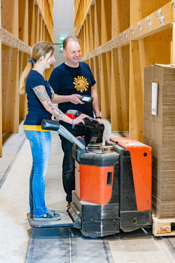 „Die erste Zeit im neuen Holz-Hochregallager war für uns ziemlich aufregend“, berichten die beiden Lageristen Klaus und Erwin. Die beiden sind für die rund 9.000 Palettenplätze in der neuen Halle hauptverantwortlich. Dort finden sich zum Beispiel viele Rohwaren, die nach der Ernte und Reinigung eingelagert werden, zwischengelagert. Genauso aber werden auch unsere fertigen Tees und Gewürze, die in ruhigeren Zeiten bereits für unsere Hauptsaison vorproduziert werden, zwischengelagert. „Das sind auch viele Weihnachtsprodukte“, erzählen die beiden.