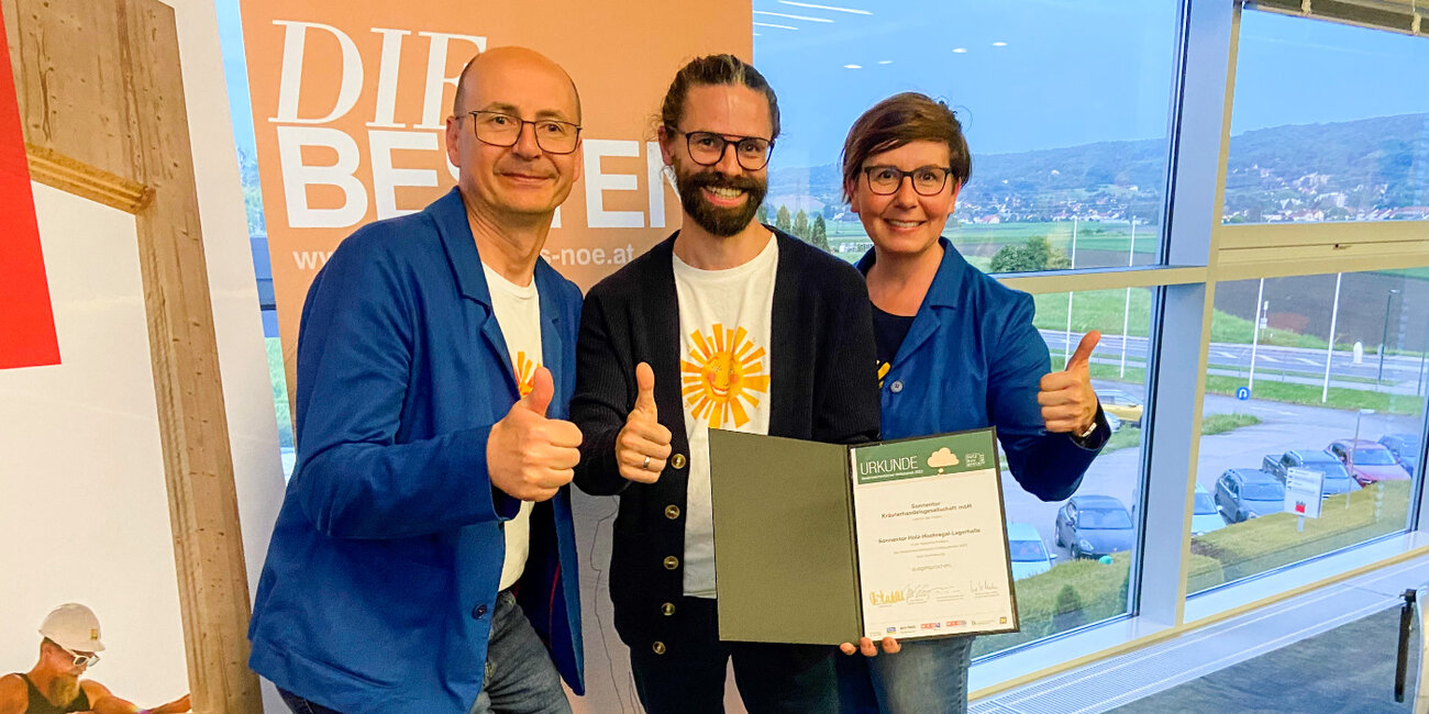 Besonders groß war die Freude als unser Hochregallager im Sommer 2023 beim Holzbaupreis NÖ ausgezeichnet wurde. Gemeinsam mit unserer Geschäftsführung konnte Lagerleiter Dietmar den Anerkennungspreis in der Kategorie „Nutzbau“ entgegennehmen. „Wir wollen Vorreiter sein und anderen zeigen, dass Bauen auch im Einklang mit der Natur möglich ist“, erzählt er stolz.