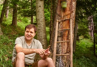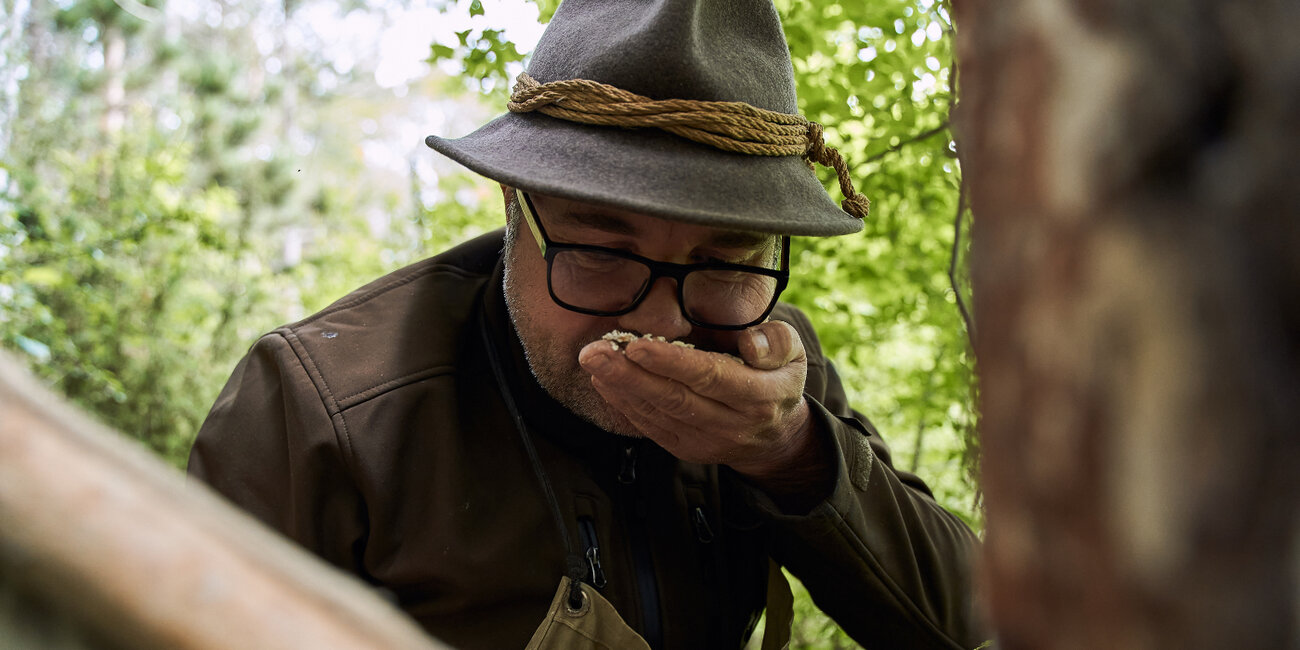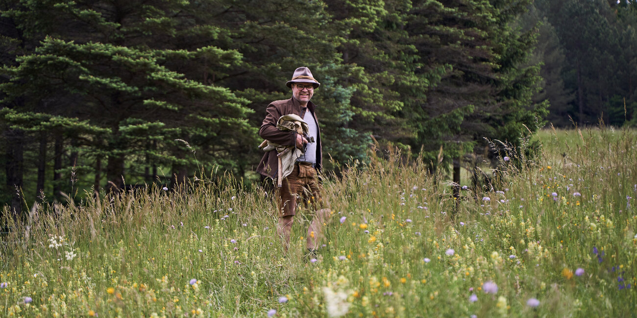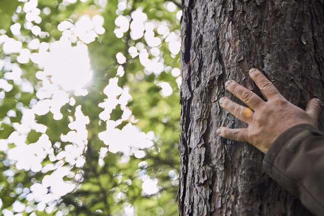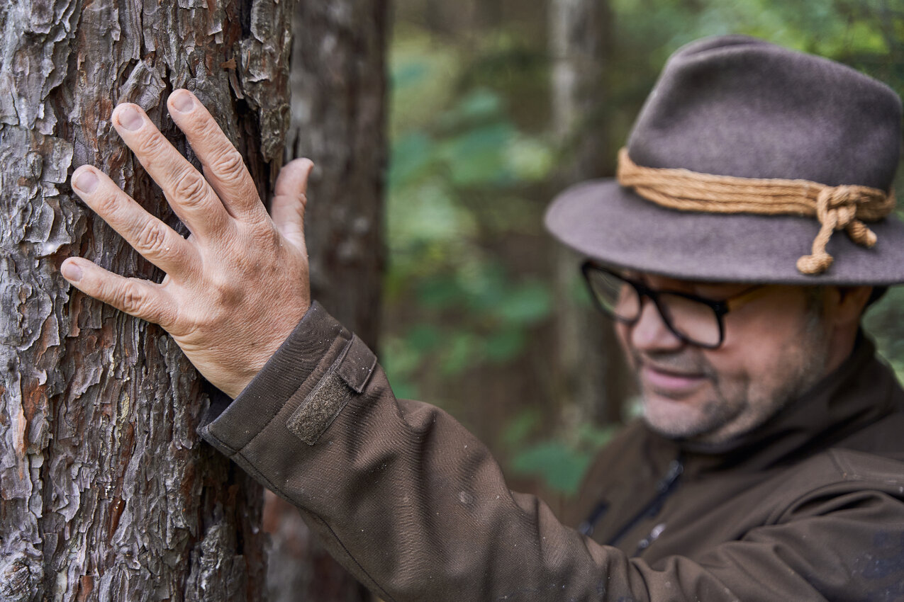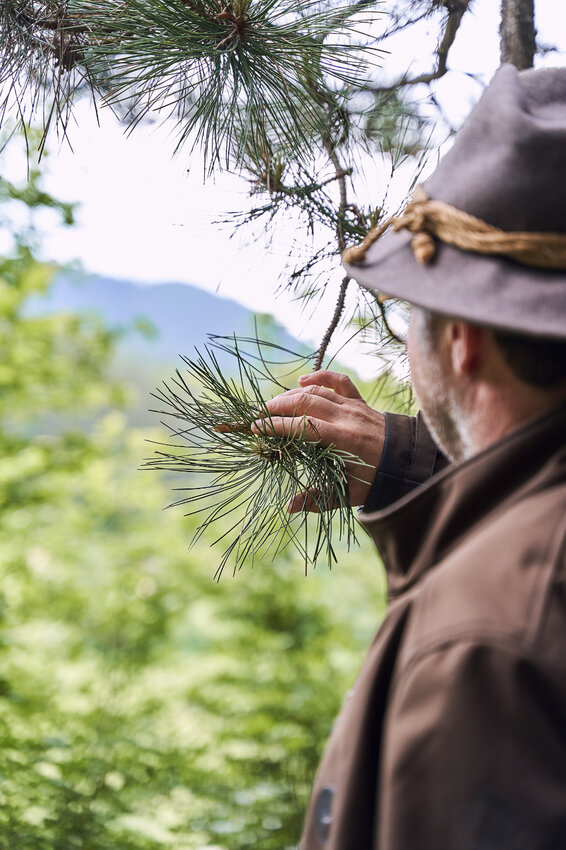 Dort, wo er lebt, ist der Wald in wenigen Schritten erreichbar. „Wenn wir als Kinder spielen wollten, sind wir in den Wald gegangen. Meine Verbindung zur Natur ist daher schon immer eine sehr enge gewesen“, sagt der 50-Jährige und streift dabei mit seiner linken Hand die Gräser am Wegesrand. Auf seinem Kopf sitzt ein grauer Filzhut und seine Beine kleidet eine Lederhose mit kunstvollen Verzierungen. Wir plaudern locker über seine Arbeit, Familie, das Wetter und sind schnell per Du. Unter unseren Schuhen fängt es an zu knistern, als wir den Wald betreten. Schlagartig umhüllt uns eine friedliche Stille und wir verlangsamen unsere Schritte. Es duftet nach den Terpenen, die die Bäume verströmen. Ihre beruhigende Wirkung ist sogleich spürbar.