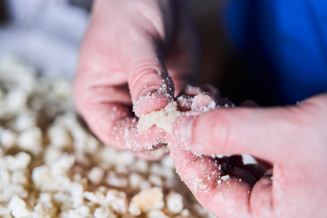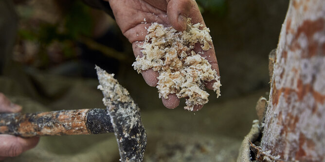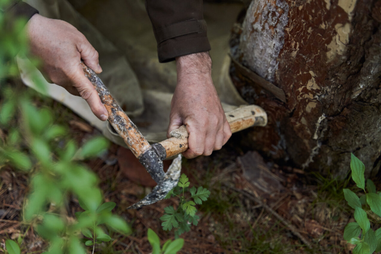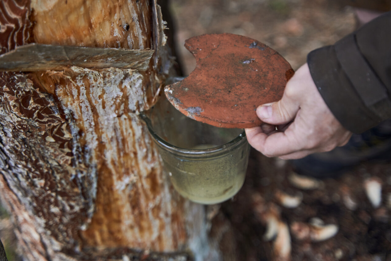„Ab Oktober braucht der Baum sein Harz für den Winter, dann höre ich auf mit dem Hobeln“, erklärt er und fährt mit der Hand sachte über die Rinde. Jetzt hockt er auf dem Waldboden und hat sich zu Vorführungszwecken den Schurz umgebunden. Behutsam schabt er das angetrocknete Harz von der Stelle, die bearbeitet wurde. Schließlich winkt er mich zu sich heran, greift in die herabgefallene, krümelige Masse und streckt mir seine Hände entgegen. Das Harz duftet süßlich nach Kräutern, Holz und einem Hauch Menthol – und es hinterlässt einen ziemlich klebrigen Film an den Händen. Um es als Räucherharz zu verwenden, muss es zwei Jahre an der Luft durchgetrocknet werden, erklärt mir Robert. In dieser Zeit verflüchtigen sich die ätherischen Öle, sodass das Harz nicht mehr entflammbar ist. Im vorelektrischen Zeitalter soll man sich diesen Effekt wiederum für Fackeln zunutze gemacht haben. Faszinierend der Gedanke, dass Menschen seit Jahrtausenden vom Baum als Roh- und Werkstoff auf vielfältige Weise profitieren.