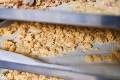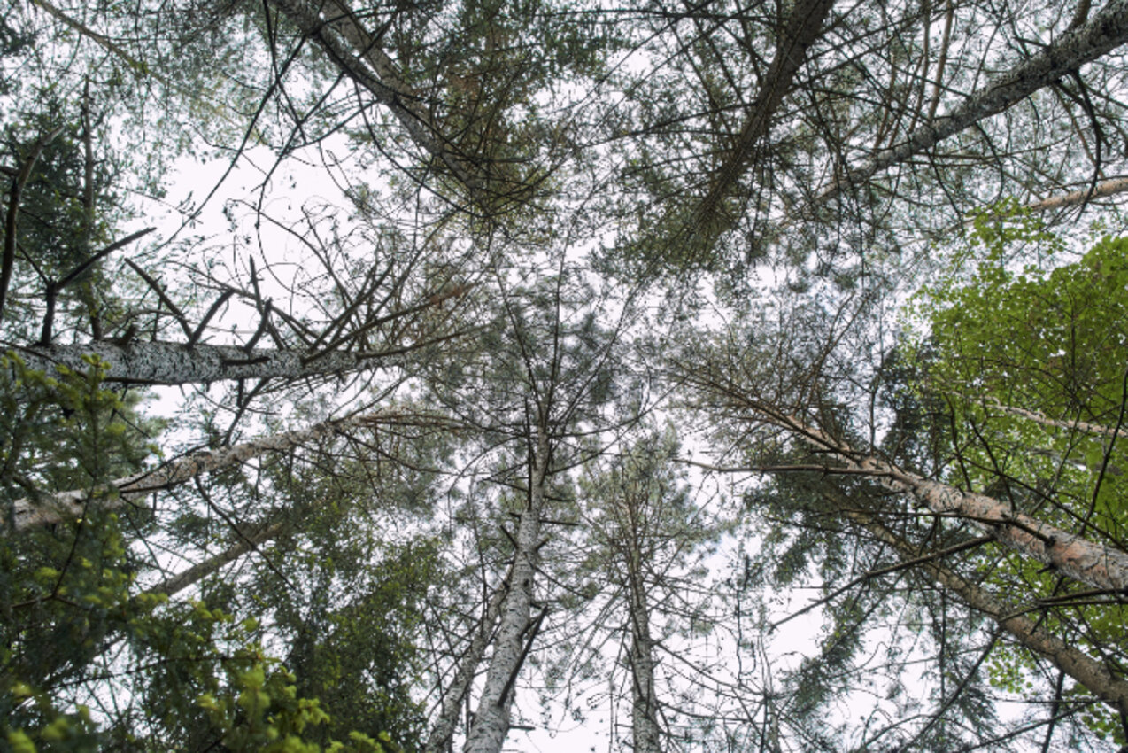 Wir stehen mittlerweile vor einer kolossalen Schwarzföhre mit gezwieseltem (dt. gegabeltem, gespaltenem) Stamm. Der Pecher schätzt ihr Alter auf 200 bis 300 Jahre. Mit dem Zeigefinger fährt er mehrere dunkle Linien am Stamm ab und erläutert: „Anhand der Einkerbungen kann man sehen, wie viele Jahre der Baum von Pechern bearbeitet wurde. Dieser hier ist das letzte Mal vor 50 Jahren gepecht worden – so alt, wie ich heute bin. Ein bisschen Harz kommt immer noch raus.“ Beim Anblick dieses standhaften Zeitzeugen überkommt uns eine feierliche Stimmung. Was diese Kiefer wohl schon alles erlebt, gehört, gesehen haben muss, frage ich mich. „Eigentlich müsste man vor diesem Baum niederknien“, unterbricht Robert die Stille. „Er lehrt uns so viel über Dankbarkeit und gegenseitigen Respekt.“