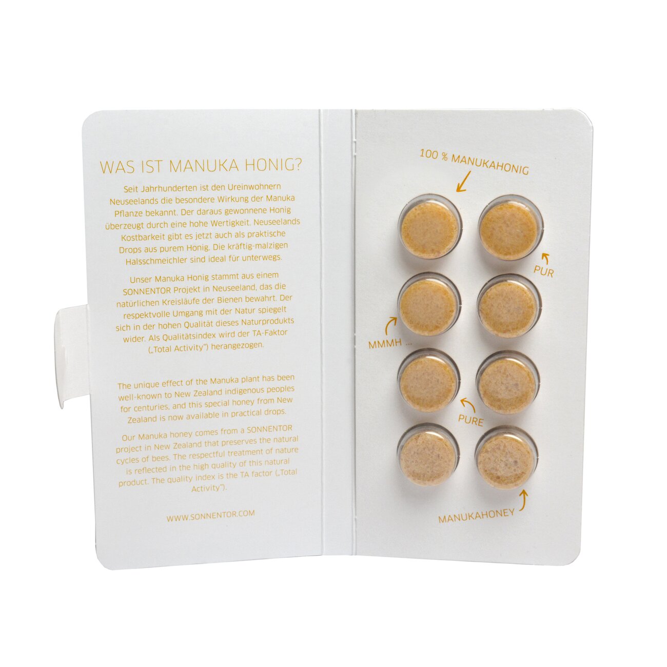Strong! The Maori, the indigenous peoples of New Zealand, knew about the extraordinary properties of Manuka. The honey is produced from the flower nectar of this New Zealand tea tree. This treasure is now also available as practical drops of pure honey. The strong and malty throat pleasers are ideal for those on the go. The quality index is the TA factor ("Total Activity").