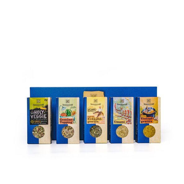 content: Holy Veggie org. package, Spud's Potatoe Spice Mix org. package, Smockey Paprika org. package, Vegetable Topping Spice Blend org., package, Umami Spice org., package. You can find the ingredients, nutrition information and allergens of each kind at the equal product.