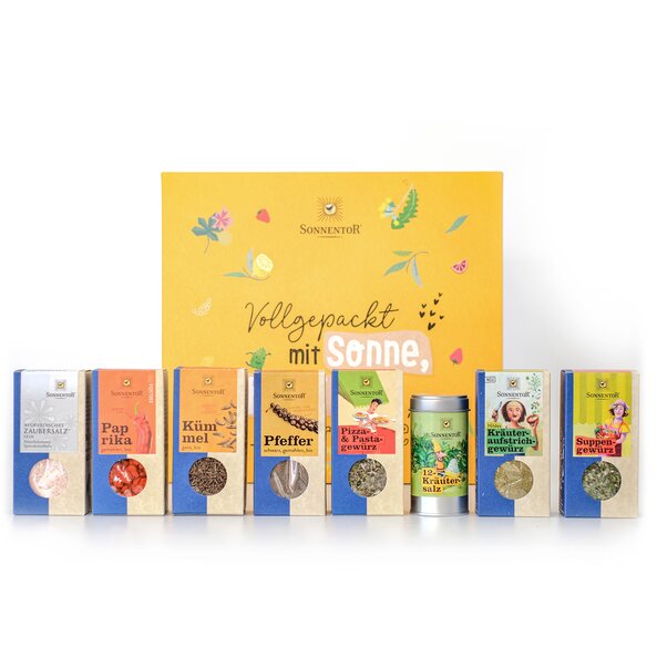 Content: 12-herbs-Salt Spice org. tin, Pepper Black ground org., package, Paprika Sweet ground org., package, Soup seasoning org., package, Pizza- and Pasta seasoning org., package; You can find the ingredients, nutrition information and allergens of each kind at the equal product.