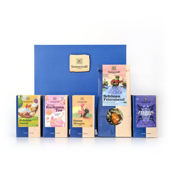 Content: Golden Turmeric Tea org., double chamber bag, Orange Fruit Tea org., double chamber bag, Family Time Tea Happiness is® org., double chamber bag, Cheery Herbal Tea org., double chamber bag, 3-Mint Tea org., double chamber bag. You can find the ingredients, nutrition information and allergens of each kind at the equal product.