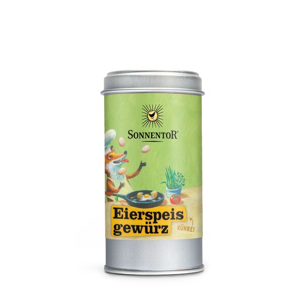 Photo of a Spice Tin Scrambled Egg Seasoning Organic Spice Preparation. On the Spice Tin is picture of a fox with a hood juggling eggs while cooking a frying egg in a pan.